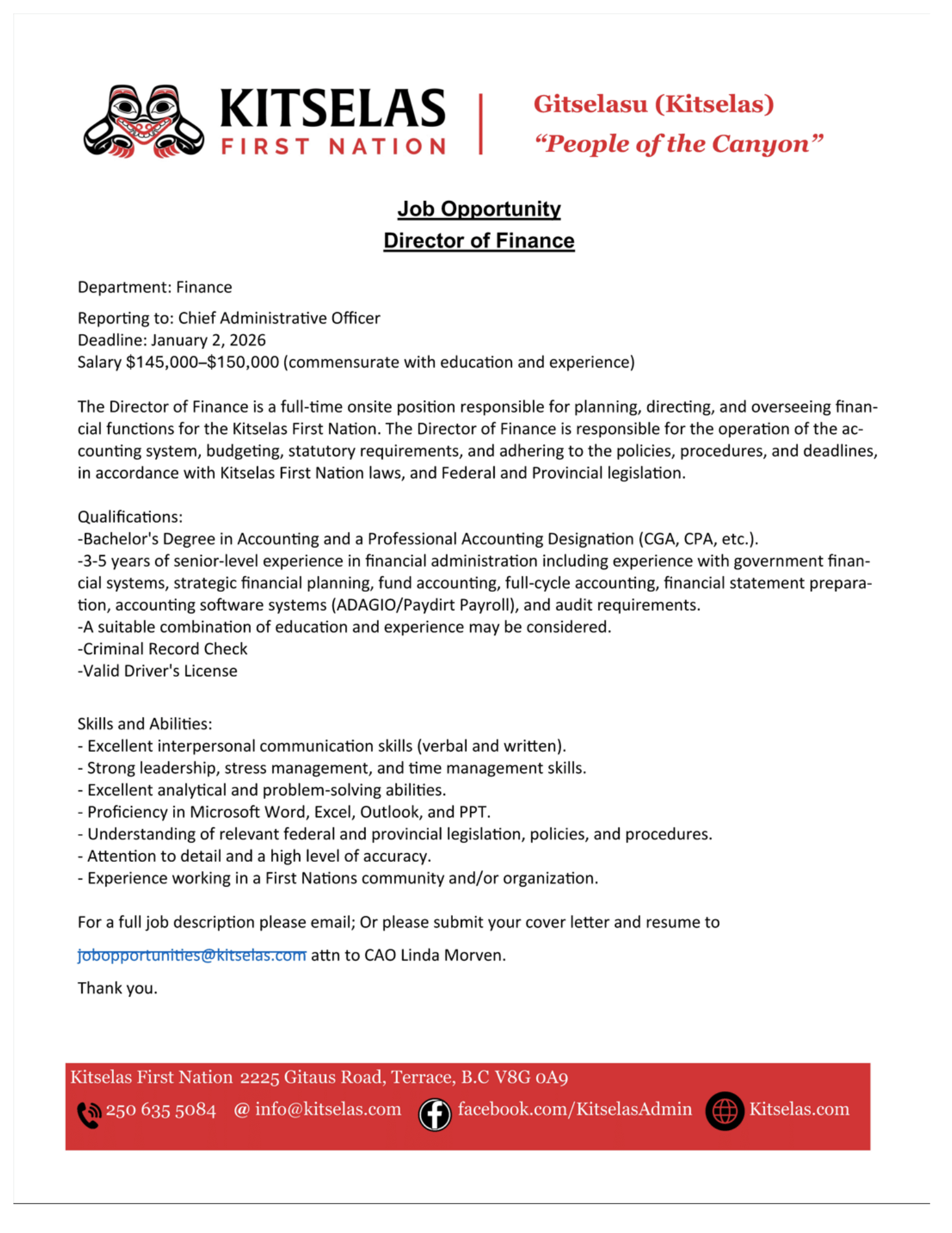 Employment Opportunities Director of Finance Community Health Nurse Community Services Clerk Language & Culture Coordinator